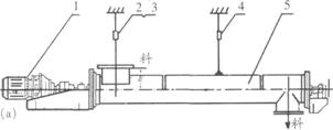 為了保證螺旋秤體橫向位置穩定,一般采用前1點后2點的3只稱重傳感器吊掛支承;而且后2點大多數設置在進料口中心的兩側,如圖2(a),但也有設置在進料口后邊減速電機的兩側,如圖2(b)。顯然,前一種懸吊點設置更為合理。因為進料口中心以后全部是設備部分自重,在生產運行時基本沒有負荷變化,根據杠桿平衡原理,后端2只稱重傳感器承受大部分皮重和物料進入進料口時的擾動,少量的物料負荷(與前測重點位置有關),物料流量負荷及其變化主要反應在前端稱重傳感器。