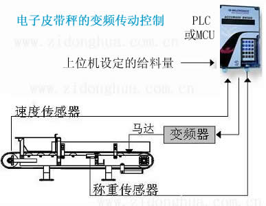 皮帶秤稱重給料機(jī)是將經(jīng)過(guò)皮帶上的物料,通過(guò)稱重秤架下的稱重傳感器進(jìn)行檢測(cè)重量,以確定皮帶上的物料重量;裝在尾部滾筒或旋轉(zhuǎn)設(shè)備上的數(shù)字式測(cè)速傳感器,連續(xù)測(cè)量給料速度,該速度傳感器的脈沖輸出正比于皮帶速度;速度信號(hào)與重量信號(hào)一起送入皮帶給料機(jī)控制器,產(chǎn)生并顯示累計(jì)量/瞬時(shí)流量。給料控制器將該流量與設(shè)定流量進(jìn)行比較,由控制器輸出信號(hào)控制變頻器調(diào)速,實(shí)現(xiàn)定量給料的要求(如圖1)。